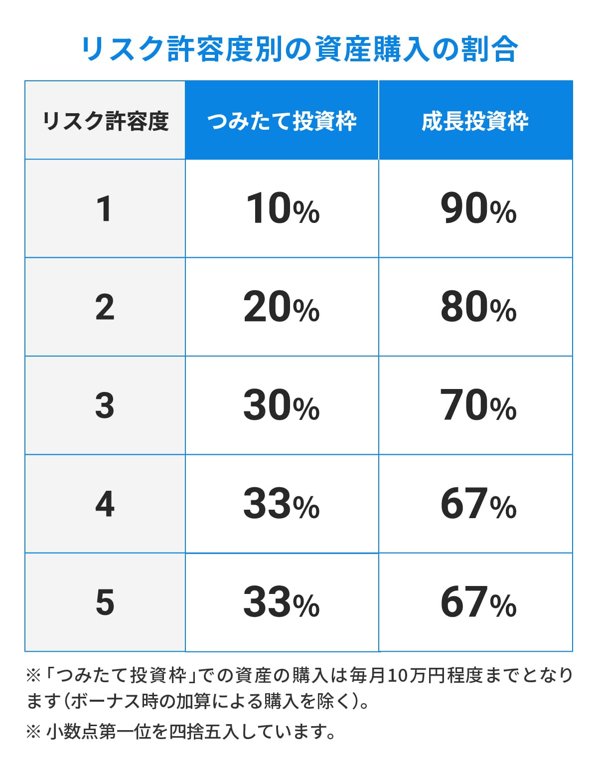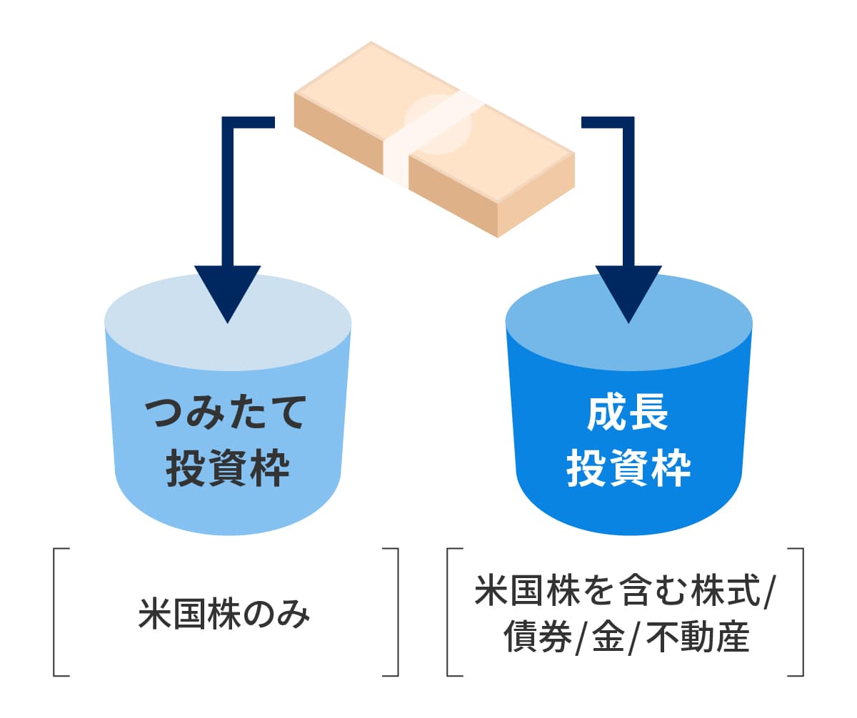 自動積立では、リスク許容度ごとに定めた割合で、つみたて投資枠と成長投資枠の両方で資産を購入し、最適な資産のバランス(最適ポートフォリオ)をめざします。その際、つみたて投資枠では、米国株のみを購入します。成長投資枠では、米国株を含む株式、債券、金、不動産を購入します。