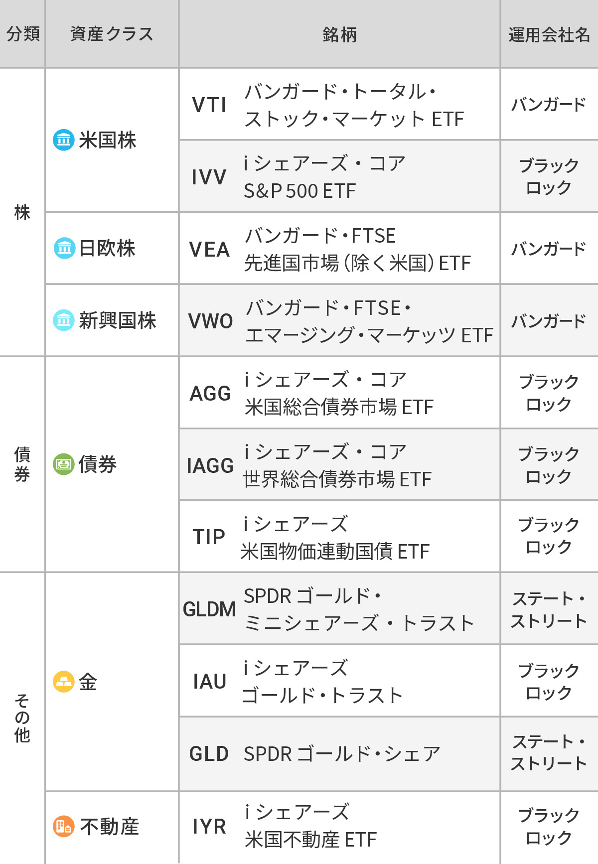 ※各資産クラスにおける投資対象の銘柄は、将来的に変わる場合があります。